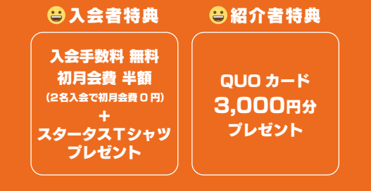 A1.紹介者は9,000円のQUOカード。入会者は3名全員が入会手数料・初月会費無料+スタータスTシャツプレゼント